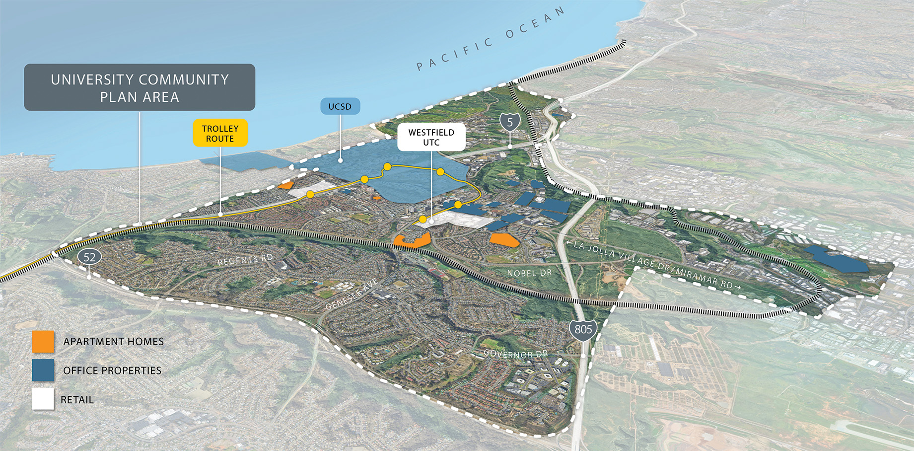 Irvine Company owns and operates a number of apartment communities in La Jolla UTC as well as best in class office properties. The commercial office properties include The Plaza, La Jolla Gateway and others that are centered around the Westfield UTC shopping center, offering pedestrian access to the mall and the adjacent UTC Transit Center trolley platform. Others are within a mile of the mall and trolley station, including Eastgate, a 26-building campus with office, R&D and lab space.